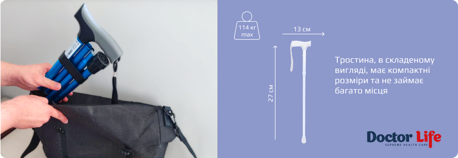 Для зручності транспортування і зберігання має додаткову петельку на рукоятці. Під час руху допомагає максимально зняти навантаження з нижніх кінцівок, тримати тіло в зручному вертикальному положенні та зберігати рівновагу.