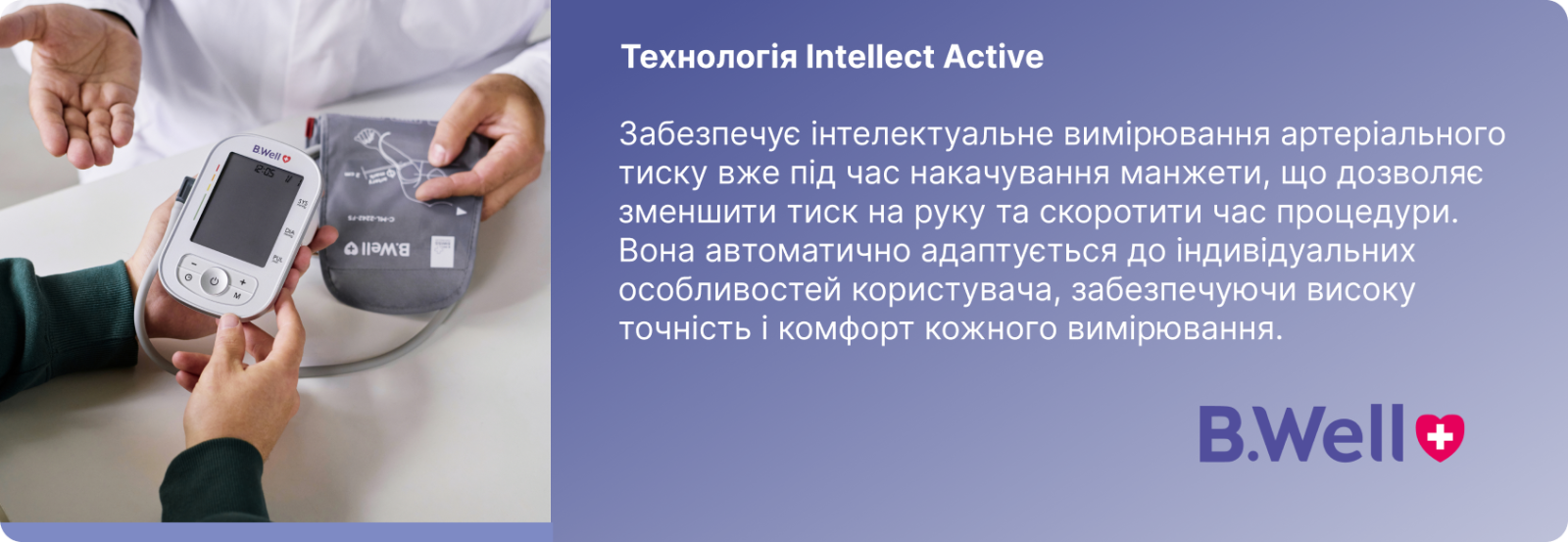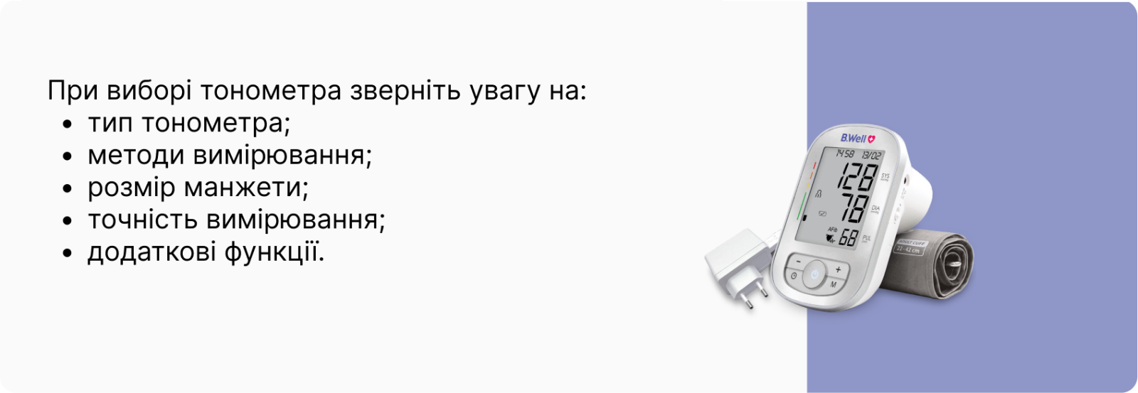 Вимір тиску з B.Well буде комфортним: анатомічна форма дозволяє уникнути зайвого стиснення руки. Манжета підходить для окружності руки 22–42 см.