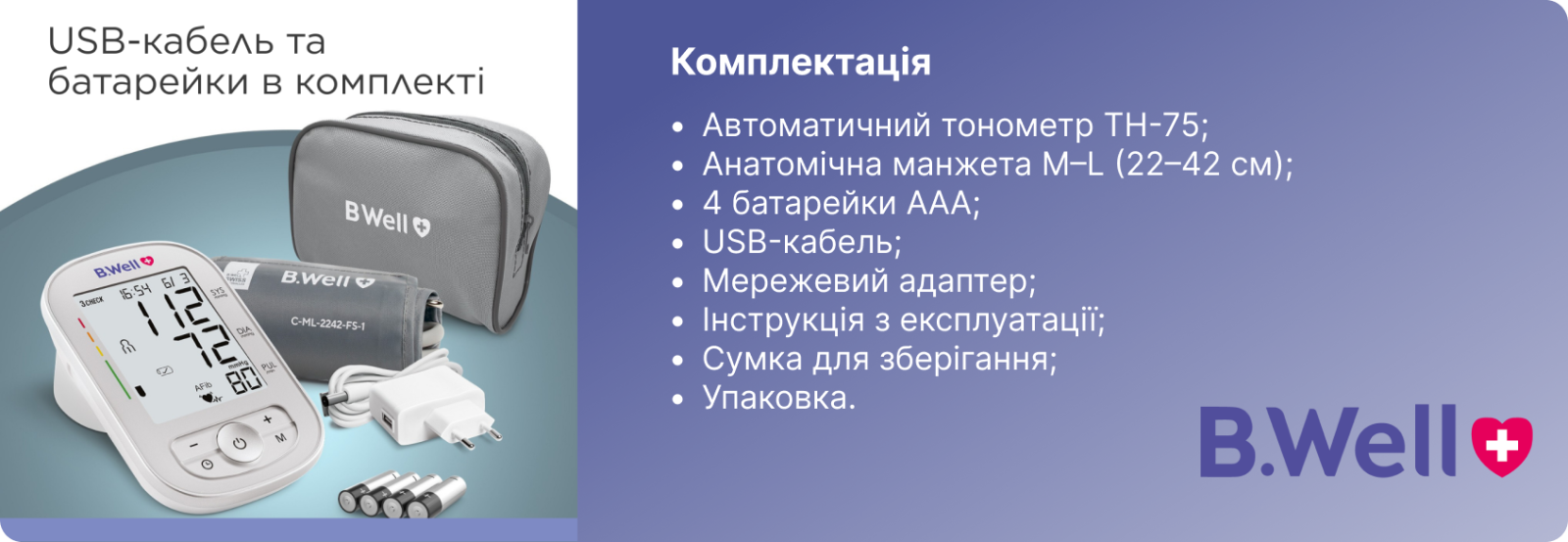 B.Well TH-75 зручно використовувати завдяки автоматичному вимірюванню під час накачування манжети, що робить процедуру швидшою та комфортнішою. Широка анатомічна манжета підходить для більшості користувачів, а індикатори правильного положення допомагають уникнути помилок під час вимірювання.