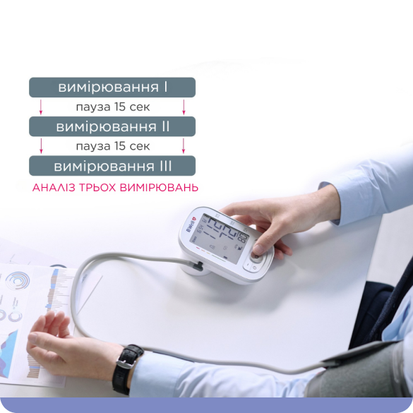 Тонометр робить 3 послідовних вимірювання з інтервалом в 15 секунд. Потім виріб проводить аналіз вимірювань, за спеціальним алгоритмом та виводить максимально точний результат.