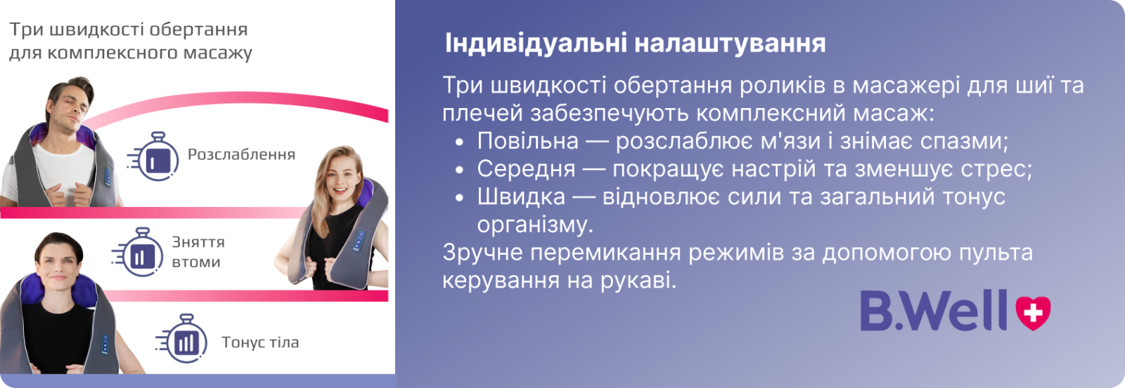 Масажер B.Well MED-440 поєднує техніки шиацу та постукування для професійного масажу. Імітація змінного тиску пальців та долонь на точках акупунктури допомагає ефективно боротися з накопиченням солей, знімає м’язову напругу та спазми, покращує кровообіг і знижує стрес. Масажер допомагає відновити сили вдома та на роботі. Завдяки трьом швидкостям обертів і функції м’якого підігріву, MED-440 ідеально підходить для масажу шиї, спини, ступнів, плечей, литок, стегон та сідниць. Масажер працює бездротово, заряджається за допомогою індукційної зарядки і може працювати до місяця без підзарядки.